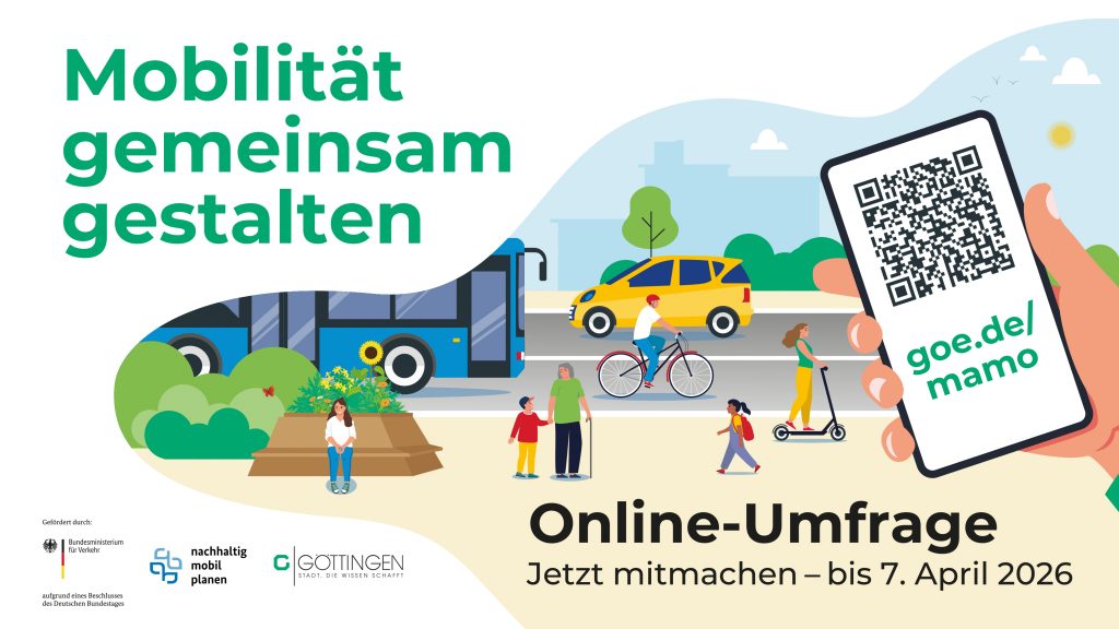 Die Umfrage ist anonym, dauert etwa 8 Minuten und läuft noch bis 07. April. Mit deiner Rückmeldung hilfst du dabei, die Sichtweisen und Bedürfnisse von Alleinerziehenden stärker zu berücksichtigen und Mobilität in Göttingen alltagstauglicher zu gestalten.
