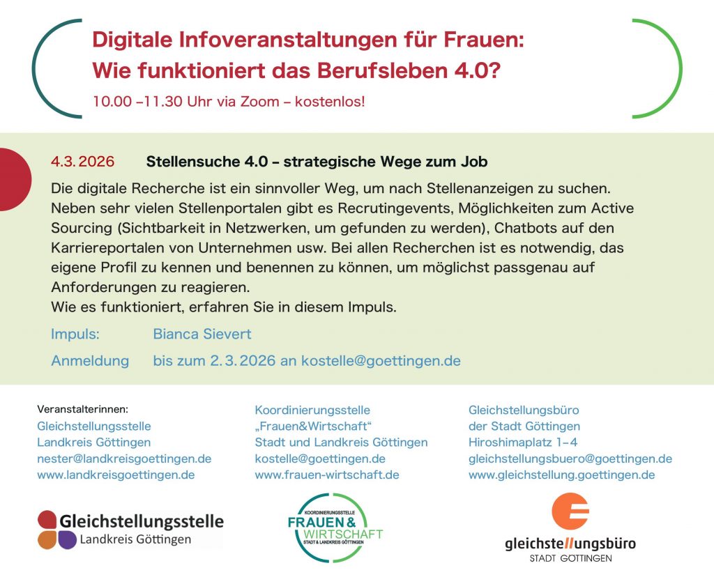 Du möchtest nach einer Familienphase wieder einsteigen, dich beruflich neu orientieren oder weiterbilden? Beim FrauenInfoTag am 18. März kannst du zwischen 09:00 und 13:00 Uhr mit Arbeitgebenden ins Gespräch kommen, dich zu Weiterbildung und Kinderbetreuung informieren und deine Bewerbungsunterlagen kostenlos checken lassen (bitte ausgedruckt mitbringen). Die Teilnahme ist kostenlos, eine Anmeldung ist nicht nötig – inklusive Kinderbetreuung und spannender Impulsvorträge. Die Veranstaltung findet in der Agentur für Arbeit Göttingen, Bahnhofsallee 5, 37081 Göttingen, statt.